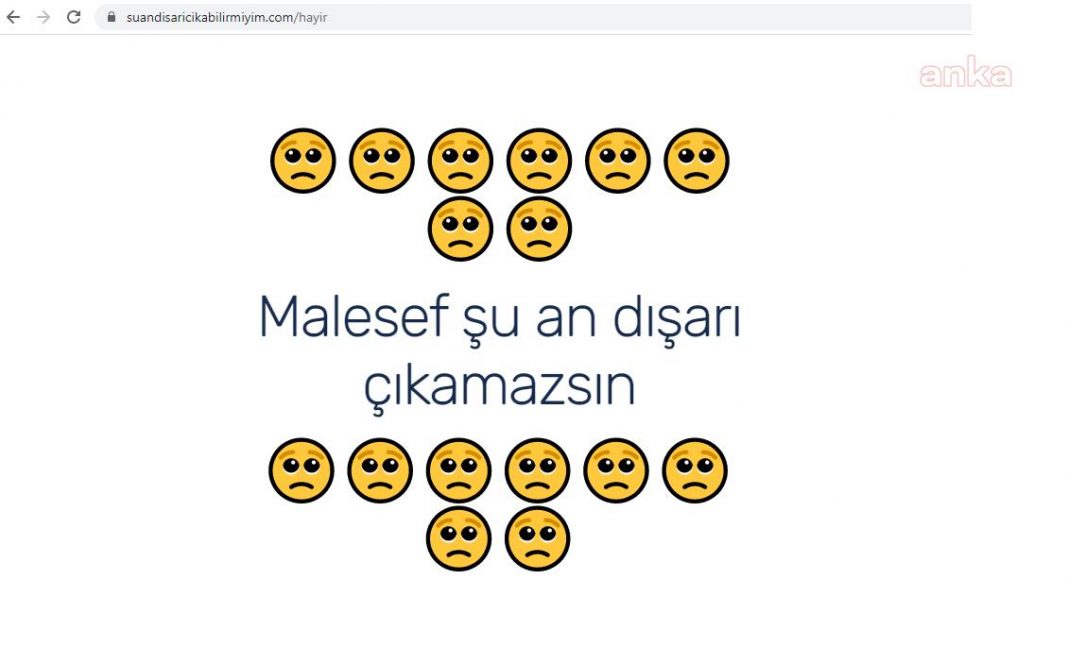 Sokağa çıkma yasağıyla ilgili kafalar karışınca http://suandisaricikabilirmiyim.com internet sitesi açıldı. Siteye girilen bilgiler ile o an sokağa çıkılıp çıkılamayacağına dair bilgi veriliyor.