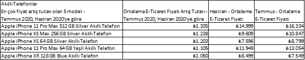 BrandZone verilerine göre akıllı telefon modellerindeki en çok fiyat artışı 1.335 TL ile Apple iPhone 11 Pro Max 512 GB’de yaşandı. 1.238 TL ile Apple iPhone XS Max 256 GB ikinci; 1.203 TL ile Apple iPhone XS 64 GB Silver Akıllı Telefon üçüncü; 1.105 TL ile Apple iPhone 11 Pro Max 64 GB dördüncü; 1.050 TL ile Apple iPhone XR 128 GB Blue Akıllı Telefon beşinci sırada yer aldı.