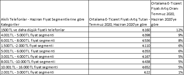 Köz, “Fiyat segmentlerine göre artış oranlarına baktığımızda yüzde 12’lik oran ile en çok fiyat artışı 1.500 TL ve daha düşük fiyatlı telefonlarda yaşandı. Yüzde 9’luk oran ile 4-5 bin TL fiyat segmentindeki telefonlar ikinci; yüzde 8’lik oran ile 6-8 bin TL fiyat segmentindeki telefonlar üçüncü; yüzde 6’lik oran ve 1.500-2 bin TL ve 5-6 bin TL fiyat segmentindeki telefonlar dördüncü sırada yer aldı” diye konuştu.