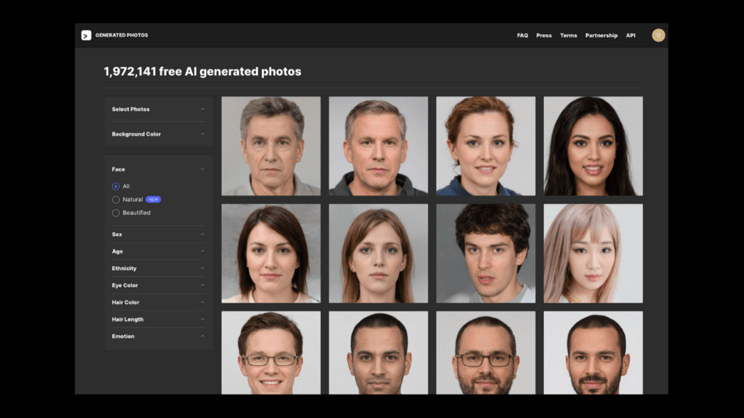 Generated Photos, yapay zeka kullanarak gerçekte olmayan yüzler geliştirip bu yüzlerin ticari olarak kullanılmasını sağlıyor. Yaklaşık 2 milyona yakın hazır yüzün bulunduğu Generated Photos, fotoğrafları şeffaf arka planlarla kullanıcıya sunuyor.